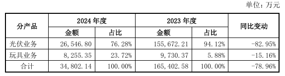 2月28日晚,三次延期之后,沐邦高科終于回復了上交所問(wèn)詢(xún)函。根據回復公告,2024年沐邦高科營(yíng)業(yè)收入為3.48億元,同比下滑78.96%。其中,光伏業(yè)務(wù)收入占比76.28%,營(yíng)收較上一年度下降82.95%,主要受到行業(yè)產(chǎn)能過(guò)剩問(wèn)題影響;玩具業(yè)務(wù)收入占比23.72%,營(yíng)收同比下降15.16%,則是轉讓子公司股權等多種因素疊加的結果。